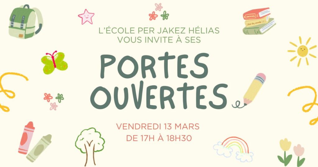Vendredi 13 mars, de 17h à 18h30, l’école Per Jakez Helias vous invite à ses portes ouvertes ! Venez à la rencontre des enseignantes et enseignants, et visiter les locaux.