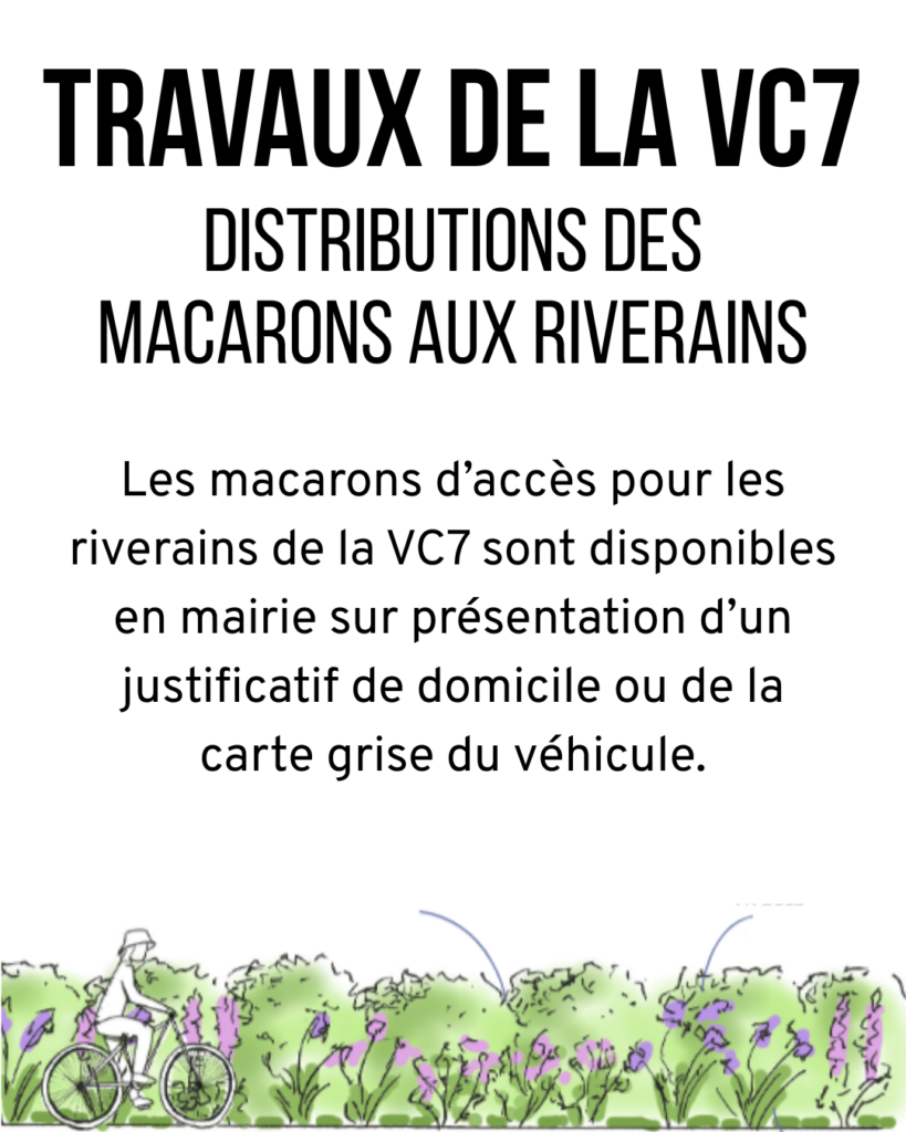 Les riverains impactés par la fermeture de la VC7 peuvent dès à présent recevoir en mairie des macarons leur permettant l’accès pour la durée des travaux, qui débutent le 16 mars pour 3 mois.